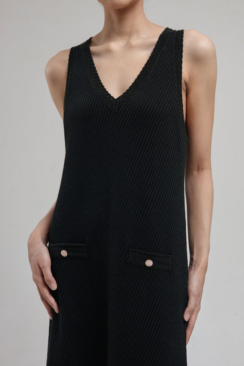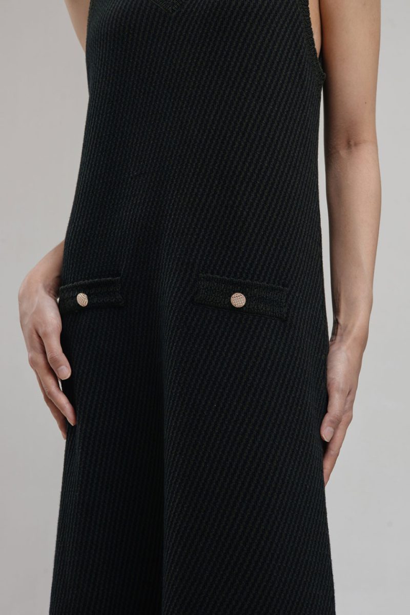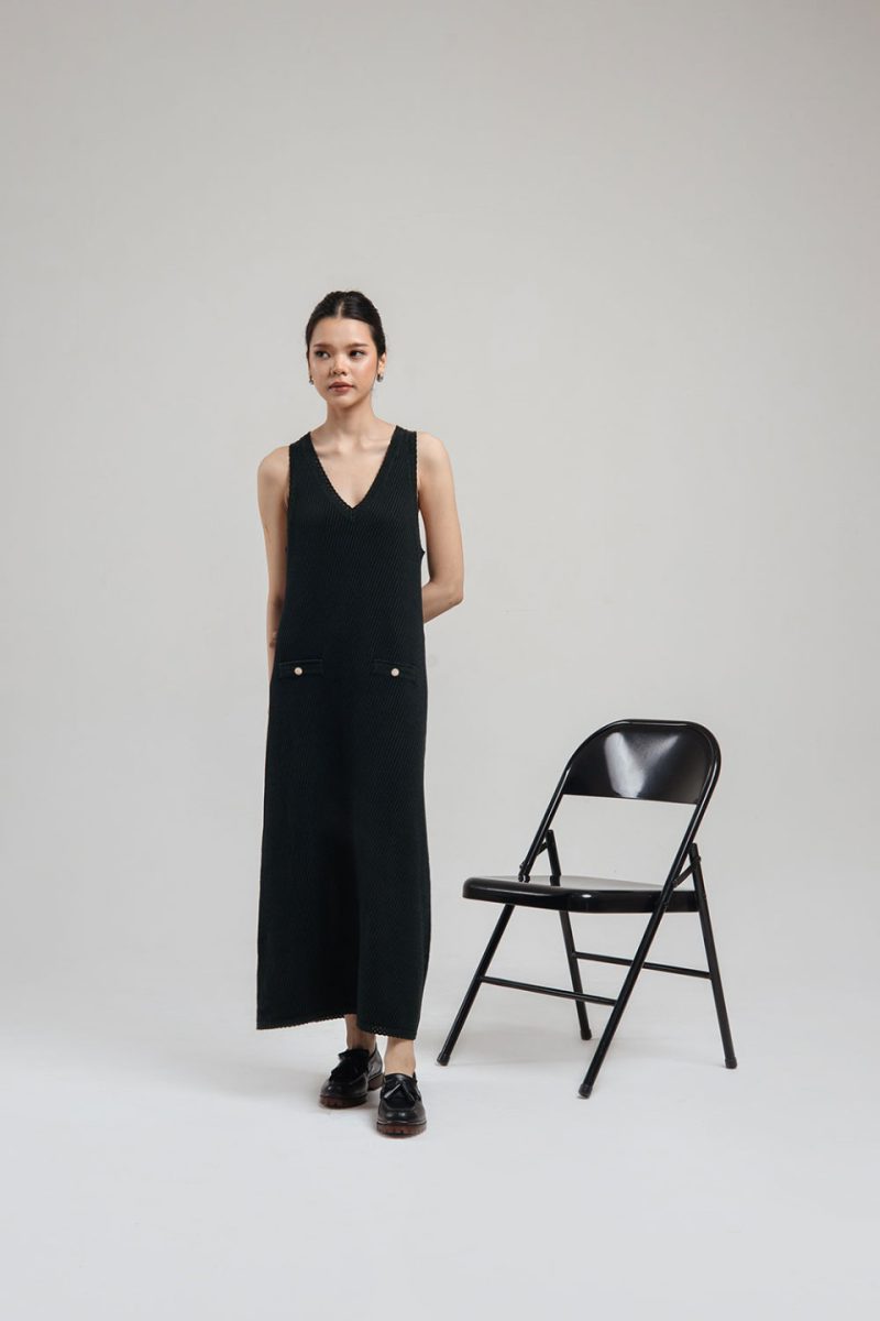 This sleeveless knit dress features a flattering V-neckline and A-line silhouette that falls gracefully to the ankles. Crafted in contrasting knit pattern, it is accented with two decorative front pockets trims and gold buttons, adding a touch of sophistication. – Available in Jade and Stripes (Black-Grey)